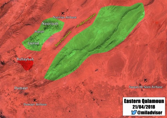 Πολλοί από τους αρχηγούς του Jaish al-Islam στο Ανατολικό Qalamoun ήταν πράκτορες των υπηρεσιών πληροφοριών του SAA . Ολοκληρώθηκε η διαδικασία για την μεταφορά εκατοντάδων τρομοκρατών και των οικογένειών τους με 35 λεωφορεία από την περιοχή του Ανατολικού Qalamoun από τις πόλεις Jeroud, Rahiba, Nasiriyah.Πάντα στο E. Qalamoun ο συριακός στρατός ανέκτησε την οροσειρά Al-Afai και Batra.