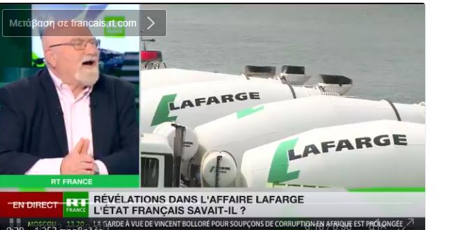 «Υπήρχαν υλικά χημικά σε αυτή τη τσιμεντοποιία (τη Lafarge) όλα αυτά πέρασαν στα χέρια διαφόρων ισλαμιστικών οργανώσεων […] oι αποδείξεις είναι συντριπτικές» δηλώνει στο rt o γαλλο-σύριος γεο-πολιτειολόγος Bassam Tahhan. Η συνεργασία ήταν αγαστή καθώς ο ίδιος αναλυτής καταγγέλει ότι δόθηκε από την εταιρεία λίστα των εργαζομένων στους ισλαμιστές για να τους εξουσιοδοτήσουν το πέρασμα , πρόσβαση. rt 25.4.18
