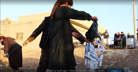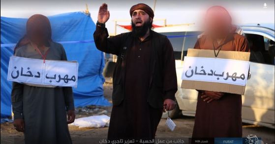 Η ISIS δημοσιοποιεί σκηνές από το έργο της ψευδο-αστυνομίας του Hesba στο ανυπόστατο κράτος του Ευφράτη όπως το αναφέρει. Είναι oι δημόσιοι ραβδισμοί 2 ατόμων για εμπορία τσιγάρων παρουσία μασκοφόρων και παιδιών. Στη συνέχεια οι τρομοκράτες προχωρούν στην καύση των τσιγάρων.