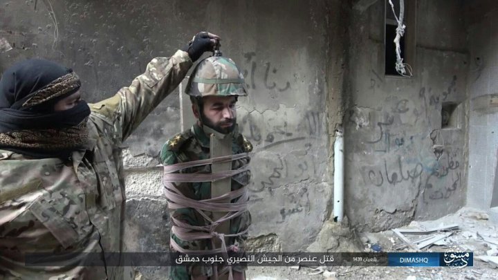 H ISIS εκτέλεσε με ειδεχθή όσο κι απάνθρωπο τρόπο έναν αιχμάλωτο αξιωματικό του συριακού στρατού στο στρατόπεδο παλαιστίνιων προσφύγων του Yarmouk.Το Ισλαμικό Κράτος χρησιμοποίησε εκρηκτικό μηχανισμό για να τον αποκεφαλίσει. Ο αξιωματικός Shadi Issa είναι δεμένος σε όρθια στάση σε πρόχειρο αυτοσχέδιο ικρίωμα. Στο κράνος του τοποθέτησαν μικροσκοπική βόμβα που την πυροδότησαν με τηλεχειριστήριο.΄Αλλοι εκτιμούν ότι τον έζωσαν με κορδέλα με εκρηκτικά ενώ στη συνέχεια τον κρέμασαν ανάποδα και τον ανατίναξαν.