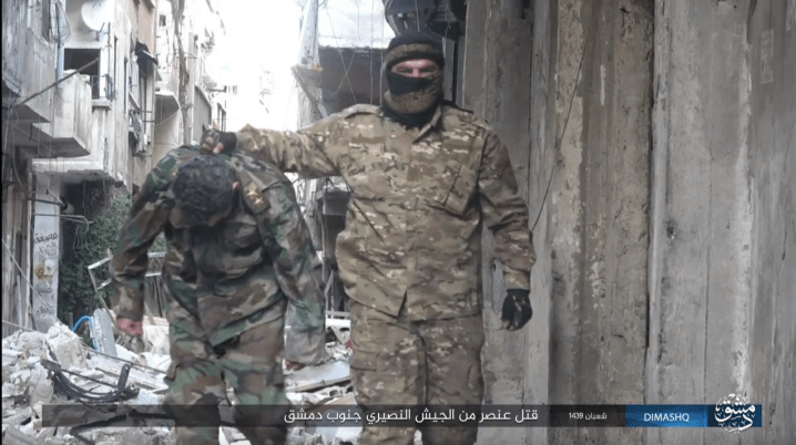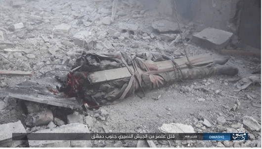 H ISIS εκτέλεσε με ειδεχθή όσο κι απάνθρωπο τρόπο έναν αιχμάλωτο αξιωματικό του συριακού στρατού στο στρατόπεδο παλαιστίνιων προσφύγων του Yarmouk.Το Ισλαμικό Κράτος χρησιμοποίησε εκρηκτικό μηχανισμό για να τον αποκεφαλίσει. Ο αξιωματικός Shadi Issa είναι δεμένος σε όρθια στάση σε πρόχειρο αυτοσχέδιο ικρίωμα. Στο κράνος του τοποθέτησαν μικροσκοπική βόμβα που την πυροδότησαν με τηλεχειριστήριο.΄Αλλοι εκτιμούν ότι τον έζωσαν με κορδέλα με εκρηκτικά ενώ στη συνέχεια τον κρέμασαν ανάποδα και τον ανατίναξαν.