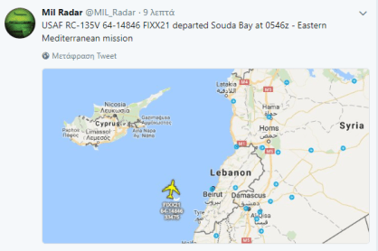Από την βάση των ΗΠΑ στη Σούδα απογειώθηκε στις 7.5.18 το αεροσκάφος των αμερικανικών δυνάμεων USAF RC-135V 64-14846 FIXX21 στις 0546z για αποστολή αναγνώρισης στην Ανατολική Μεσόγειο αναφέρει τώρα το Mil Radar. Σε εποχή έντασης στη Μέση Ανατολή με φόντο το συριακό και την αμερικανορωσική διαπάλη η αμερικάνικη βάση στην Κρήτη αποδεικνύεται επιχειρησιακό κέντρο των δυτικών δυνάμεων.