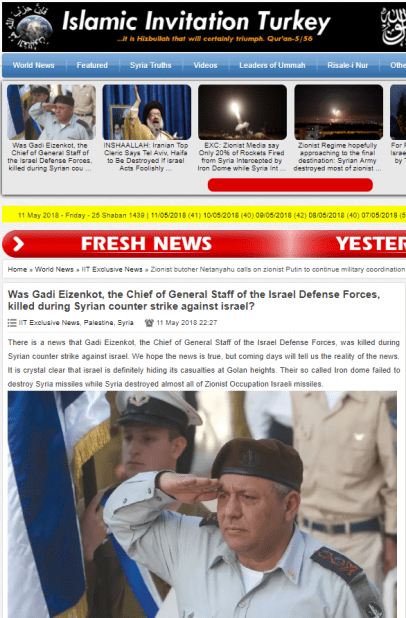 Yπάρχει μια είδηση ότι ο Gadi Eizenkot, ο ισραηλινός ΓΕΣ σκοτώθηκε κατά τη διάρκεια συριακού χτυπήματος κατά Ισραήλ.Τι επόμενες μέρες θα γνωρίζουμε αν είναι βάσιμη η είδηση.Είναι απολύτως φανερό ότι το Ισραήλ κρύβει τις απώλειες που είχε στο Golan.Ο Σιδερένιος Θόλος απέτυχε ν΄ καταστρέψει τους συριακούς πυραύλους αναφέρει το islamicinvitationturkey.