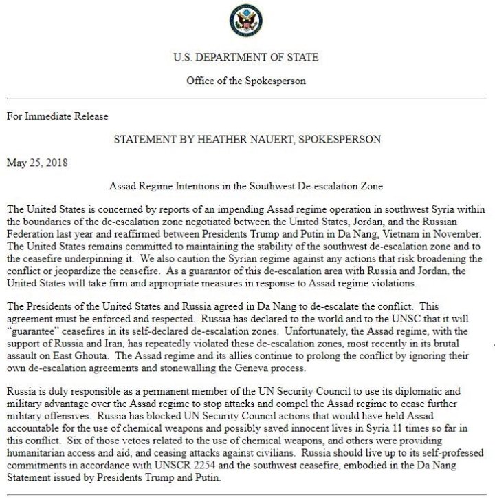 «Προειδοποιούμε ομοίως το συριακό καθεστώς κατά κάθε δράσης που θα μπορούσε να σπάσει την εκεχειρία », αναφέρει η εκπρόσωπος τύπου του ΥΠΕΞ ΗΠΑ η Heather Nauert, υπογραμμίζοντας ότι αυτή η κατάπαυση πυρός επαναβεβαιώθηκε από τον  Donald Trump και τον  Vladimir Poutine το Νοέμβρη στο Da Nang στο Βιετνάμ..