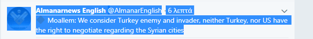 O Moallem είπε: θεωρούμε την Τουρκία εχθρό κι εισβολέα. Ούτε η Τουρκία ούτε οι ΗΠΑ έχουν το δικαίωμα να διαπραγματεύονται αναφορικά με τις συριακές πόλεις.al manar