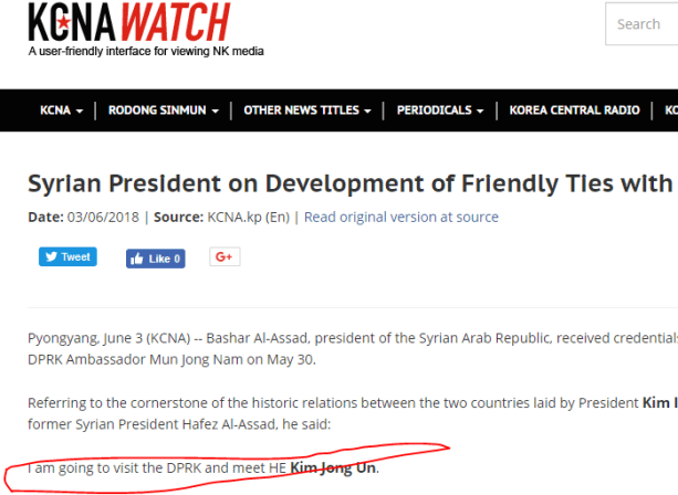 « Ο κόσμος χαιρετίζει τα αξιοσημείωτα γεγονότα που επήλθαν πρόσφατα στη χερσόνησο της Κορέας χάρη στο εξαιρετικό υψηλό επίπεδο και τη σοφία του διευθύνοντα Kim Jong Un » δήλωσε ο σύριος πρόεδρος σύμφωνα με το KCNA, κατά τη συνάντηση με τον πρέσβη της Β Κορέας τον Mun Jong Nam την Τετάρτη 30.5.18 κατά την παρουσίαση των διαπιστευτηρίων του. O Assad σύμφωνα με το πρακτορείο εξέφρασε την εμπιστοσύνη του στην επιτυχία της επανένωσης των 2 χωρών Β και Ν Κορέας.