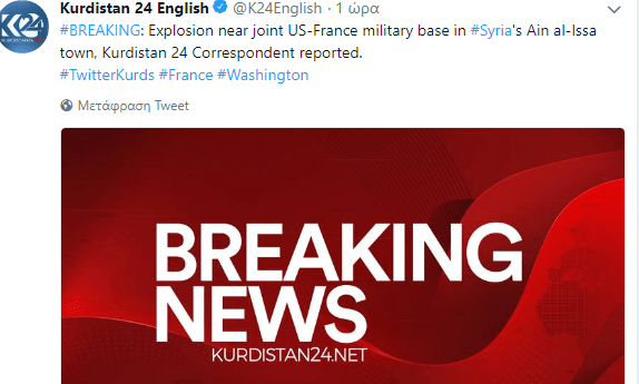 Έκρηξη κοντά στην αμερικανο-γαλλική βάση στη Βόρεια Συρία στην πόλη Ain al-Issa αναφέρει ανταποκριτής του κούρδικου πρακτορείου Kurdistan 24. Η πόλη βρίσκεται στο βόρειο τμήμα του κυβερνείου της Raqqa.Η στρατιωτική βάση βρίσκεται κοντά στην πόλη Ain al Issa και φιλοξενεί 200 Αμερικανούς και 75 Γάλλους στρατιώτες.Η τουρκική έκδοση του τηλεοπτικού καναλιού Κουρδιστάν 24 αναφέρει, επικαλούμενη τοπικές πηγές, ότι η πιθανή αιτία του συμβάντος θα μπορούσε να είναι μια έκρηξη πυρομαχικών. Η έκρηξη σημειώθηκε την νύχτα. Άλλη πληροφορία αναφέρει ότι ένα παγιδευμένο όχημα ανατινάχθηκε σε ένα checkpoint των sdf στην Ayn Issa. Πρόκειται για μια ισχυρή έκρηξη.