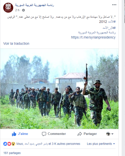 O συριακός στρατός καθαρίζει σπιθαμή σπιθαμή το συριακό έδαφος από την τρομοκρατία. Στο ίδιο πνεύμα η συριακή προεδρία που δια του επίσημου λογαριασμού της υπενθυμίζει ρήση του Άσαντ τώρα: « .. ούτε επιείκεια ούτε συμβιβασμό με την τρομοκρατία ούτε με εκείνους που την υποστηρίζουν .. Και συγχωρήστε μόνο όσους την εγκατέλειψαν .. » (πρόεδρος Assad 2012)