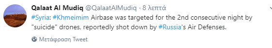 To presstv μεταφέρει ότι για δεύτερη φορά σε 48 ώρες οι τρομοκρατικές ομάδες στα ΒΔ της Συρίας στο Idlib εξαπέλυσαν μια επίθεση με drones κατά της ρώσικης βάσης Hmeimim στη Lattaquié. Σύμφωνα με πηγή στρατιωτική από την πόλη Jableh, άγνωστη τρομοκρατική ομάδα στόχευσε την αεροπορική βάση Hmeimim με επανδρωμένα drone. H πηγή δήλωσε ότι ο ρωσικός στρατός πέτυχε ν΄αναχαιτίσει τα drones στην επίθεση στη ΒΑ περίμετρο της βάσης του Hmeimim.