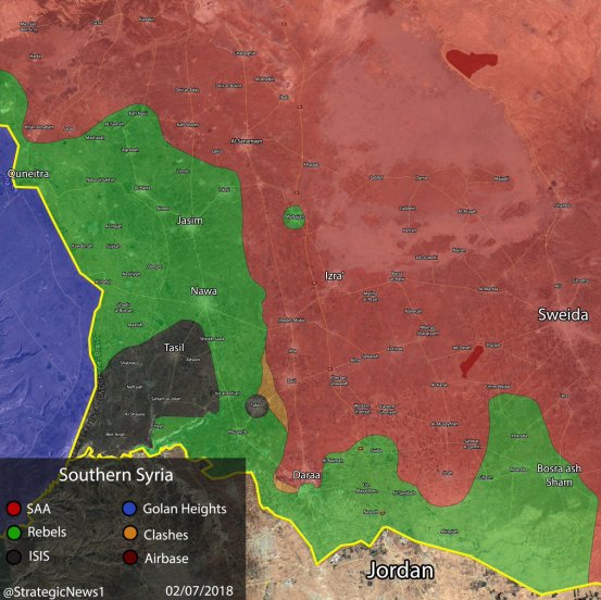 Σύμφωνα με το φιλοαντιπολιτευόμενο OSDH που εδρεύει στο Λονδίνο ο συριακός στρατός ελέγχει πλέον τα δύο τρίτα της επαρχίας της Daraa κι αυτή η εξέλιξε επέρχεται μετά από την αρχή της επιχείρησης του στις 19 Ιούνη. Στον χάρτη ελέγχου υπάρχει δηλαδή πλήρης αντιστροφή και μεγαλειώδης ανατροπή αφού πριν την επιχείρηση ήταν οι δυνάμεις των τρομοκρατών που ήλεγχαν το 70% της ίδιας επαρχίας.