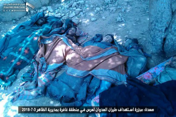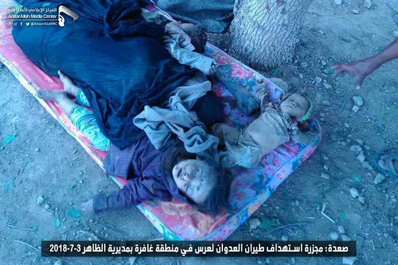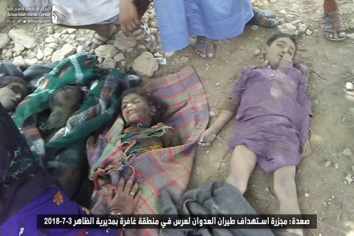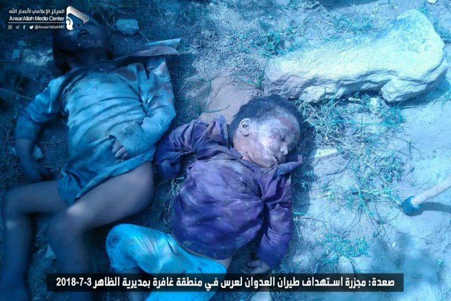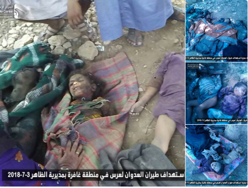 Eικόνες από τη σφαγή αμάχων που προκάλεσε αεροπορική επιδρομή της συμμαχίας της Σαουδικής Αραβίας σ΄ένα γάμο στην περιοχή Ghafra στην Zaher στο κυβερνείο της Saada στο βορρά της Υεμένης με απολογισμό 22 νεκρούς και τραυματίες.Οι περισσότεροι είναι γυναικόπαιδα. Ο ΟΗΕ δια της UNICEF ανακοίνωσε την Τρίτη ότι τουλάχιστον 2200 σκοτώθηκαν και 3400 τραυματίστηκαν κατά τη διάρκεια του πολέμου από το 2015.