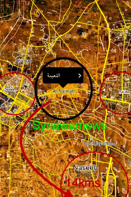 O συριακός στρατός συνεχίζοντας το σερί των επιτυχιών του στο συριακό νότο  απελευθέρωσε και την πόλη Naima όπως και το τάγμα των radar στην περιφέρεια της Daraa. Οι τρομοκράτες αποσύρθηκαν από την πόλη Naima στην ανατολική περιφέρεια της Daraa μετά από σφοδρές μάχες με τον SAA. Προηγουμένως ο στρατός έθεσε υπό τον έλεγχό του και τα χωριά “Smg” ”Samad” “Tisya” “Khirbet qulwa” “Abu-Qatouna” “Nada” “Maqtala” “Al-Smakyat” “Ard-Altrash” “Al-Aman” και 9 συνοριακές θέσεις στα σύνορα με την Ιορδανία όπου ήδη έχει αναπτυχθεί συνοδεία και της ρωσικής στρατονομίας.Άλλα 230 και πλέον τ.χλμ απελευθερώθηκαν στο συριακό νότο.O συριακός στρατός ανέκτησε τη διεθνής διασταύρωση  που ξεκινά από την πόλη “Khirbet Ghazala” και απελευθέρωσε ακόμη και την πόλη “Naseeb” στην ύπαιθρο της Daraa. Αν και άλλες αναφορές φέρουν το στρατό στα 3χλμ από την πόλη αυτή όπου ο κόσμος έχει ξεσηκωθεί και ζητά να μπει ο στρατός. O στρατός στο πέρασμά του ανέκτησε 3 στρατιωτικές βάσεις ακόμη. ο στρατός ανέκτησε τις θέσεις 63-70 στα ιορδανικά σύνορα στη Daara.