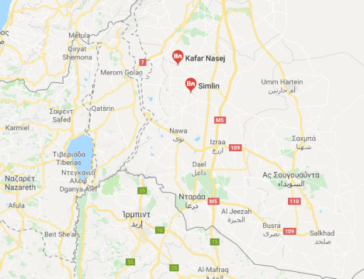 Σύμφωνα με το Sana πριν λίγο συμφωνία επιτεύχθηκε μεταξύ συριακού κράτους και τρομοκρατικών ομάδων που θα τεθεί σε ισχύ από αύριο το απόγευμα και προβλέπει για τα χωριά Simlin, Kafr Shams, Kafr Nasij,Aqraba στη Daraa ότι οι τρομοκράτες οφείλουν να παραδώσουν το βαρύ και μεσαίο οπλισμό τους και τη διευθέτηση του στάτους των ”ενόπλων” που επιθυμούν να παραμείνουν. Αποκατάσταση των κρατικών θεσμών στους εν λόγω τομείς και τη βοήθεια για την επιστροφή αυτών που εκτοπίστηκαν. Τα χωριά είναι σχετικά κοντά στα κατεχόμενα του Γκολάν.