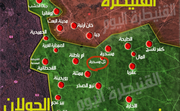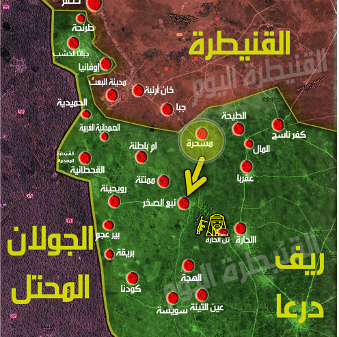 Πρόκειται για το χωριό Mashara, στα 11 km από τα σύνορα του Golan που ο στρατός απελευθέρωσε ύστερα από σφοδρούς βομβαρδισμούς κατά θέσεων τρομοκρατών και μάχες με την al Nusra. Οι κυβερνητικές δυνάμεις ομοίως σφυροκόπησαν θέσεις τρομοκρατών στην πόλη al Haara, στην επαρχία της Deraa. Η συριακή κυβέρνηση με την υποστήριξη της ρωσικής αεροπορίας εξαπέλυσε τον τελευταίο μήνα μια επίθεση που της επέτρεψε ν΄ανακτήσει το μεγαλύτερο μέρος αυτής της ευαίσθητης ζώνης κοντά στην Ιορδανία και στα υψίπεδα του Golan. Ο στρατός ύψωσε τη συριακή σημαία ως και μέσα στην πόλη της Daraa που την απελευθέρωσε. Αναμένεται μεγάλη επίθεση του συριακού στρατού στην περιφέρεια της Κουνέιτρα αν δεν ευδοκιμήσουν οι διαπραγματεύσεις. Σήμερα 1500 τρομοκράτες κι οι οικογένειες τους από Daraa θα μεταφερθούν στο Idlib.