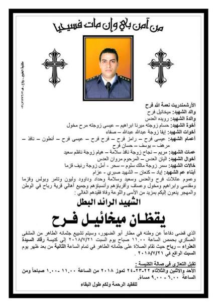 Έγινε η αναγνώριση- ταυτοποίηση του σώματος σύριου χριστιανού πιλότου του Michael Farah. Ο αξιωματικός υπηρετούσε στο αεροδρόμιο του Abu al-Duhur στο κυβερνείο του Idlib. To στρατιωτικό αυτό αεροδρόμιο περιήλθε πριν μερικούς μήνες στο συριακό στρατό στη διείσδυσή του στην διοικητική περιφέρεια του Idlib.