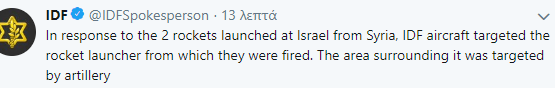 Πριν από λίγο ο ισραηλινός στρατός στον επίσημο λογαριασμό του ανακοινώνει ” σε απάντηση 2 ρουκετών που προήλθαν από τη Συρία στο Ισραήλ αεροπλάνο του IDF στόχευσαν τον εκτοξευτή ρουκετών από όπου προήλθαν τα πυρά.Ο περιβάλλοντας χώρος στοχεύθηκε από το πυροβολικό.”
