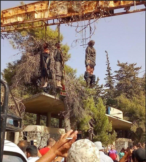 O λαός της Sweida στη συνέχεια κρέμασε κι άλλους επίδοξους καμικάζι από την Πύλη του Κρατικού Νοσοκομείου της Πόλης που ήταν στόχος των βομβιστών αυτοκτονίας.