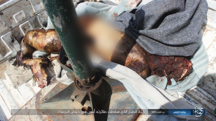H τρομοκρατική οργάνωση ISIS διακινεί φωτογραφίες από το συριακό μαχητικό Su-22M4 που συνετρίβη χθες στην Wadi Yarmouk στην Quneitra ενώ επιχειρούσε εναντίον των θέσεων της και στοχεύθηκε από ισραηλινούς πυραύλους Patriot. Mάλιστα δημοσιεύει νέες φωτογραφίες του πιλότου που έχει ακρωτηριαστεί και απανθρακωθεί κατά τη συντριβή. Η ISIS χθες ταυτοποίησε τον πιλότο ως τον Omran Marii.