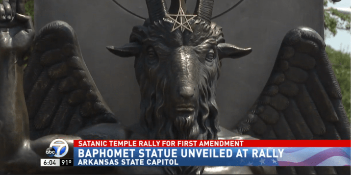 Μετά την εγκατάσταση του μνημείου Δέκα Εντολές, ο Ναός του Σατανά κατέθεσε αγωγή για να τοποθετήσει το άγαλμα του με τους ίδιους λόγους στο όνομα του θρησκευτικού πλουραλισμού και της Πρώτης Τροποποίησης.