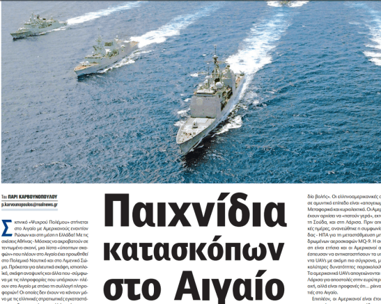 Σύμφωνα με το Real,οι ΗΠΑ εντατικοποίησαν την δραστηριότητά του στην περιοχή μέχρι να την μεταμορφώσουν σε ένα αληθινό πολύγωνο.«To Aιγαίο Πέλαγος θυμίζει πάντα περισσότερο ένα αμερικάνικο πολύγωνο. Οι ελληνοαμερικανικές σχέσεις έφθασαν στο απόγειό τους κατ΄ουσίαν au sens propre et au sens figuré. Εδώ και κάποιες μέρες Ελλάδα και ΗΠΑ ont prorogé τη συμφωνία τους για την ανάπτυξη drones MQ-9», γράφει το média σύμφωνα με το οποίο οι Αμερικανοί θ΄αντικαταστήσουν τα drones που έχουν αναπτύξει στη βάση τους στη Λάρισα από άλλα πιο σύγχρονα προορισμένα να επιτελέσουν αποστολές αναγνώρισης στο Αιγαίο. sputnik26.8.18