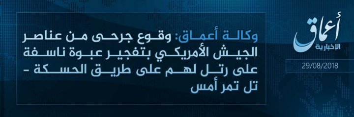 Το Ισλαμικό Κράτος ανακοίνωσε πως τραυματίστηκαν Αμερικανοί στρατιώτες σε επίθεση με εκρηκτικό μηχανισμό κατά στρατιωτικού Convoy που εκινείτο από τη Hasakah προς το Tal Tamer στη Βόρεια Συρία. Αρκετοί Αμερικανοί στρατιώτες τραυματίστηκαν από τη βόμβα που ήταν τοποθετημένη στην άκρη του δρόμου.