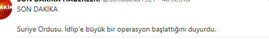 Σύμφωνα με συριακές φιλοκυβερνητικές δημοσιογραφικές πηγές που προέρχονται από το Ιντλίμπ έγινε η έναρξη της μεγάλης στρατιωτικής επιχείρησης για την απελευθέρωση του Idlib. Η πηγή μάλιστα μέμφεται τους ακτιβιστές που δεν καλύπτουν αυτή την είδηση που δεν την αναφέρουν…..Διασταυρώνεται η πληροφορία από αλλού όπου σημειώνεται ότι ο στρατός ξεκίνησε την επιχείρηση στην Β Λατάκια όπου και σκότωσε 2 υψηλόβαθμους της αλ Νούσρα. Τούρκικη πηγή τώρα επιβεβαιώνει την αρχική πληροφορία ότι ο συριακός στρατός ανακοίνωσε πως άρχισε μια μεγάλη επιχείρηση απελευθέρωσης του Ιντλίμπ.