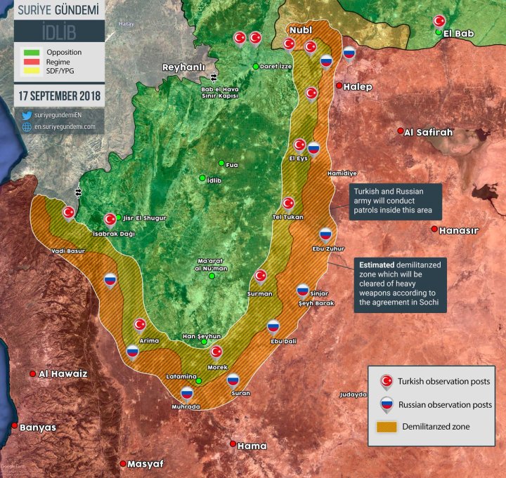 Ο Putin μετά τη συνάντηση με Ερντογάν είπε ότι αποφάσισαν να δημιουργήσουν αποστρατιωτικοποιημένη ζώνη στη γραμμή επαφής μεταξύ ανταρτών και συριακών δυνάμεων στο Ιdlib και ότι η ζώνη θα δημιουργηθεί από 15 Οκτώβρη.
