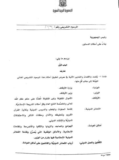 Πρόκειται για ένα διάταγμα που υπογράφηκε από τον πρόεδρο Μπασάρ Αλ Ασάντ στις 20 Σεπτεμβρίου και προκάλεσε τις αντιδράσεις των οπαδών του Assad αφού θεωρείται ότι ενισχύει την επιρροή του συντηρητικού Ισλάμ στη συριακή κοινωνία.