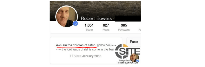 Μια αναφορά επίσης ψηλά στη σελίδα του Bowers δήλωνε: “οι Εβραίοι είναι παιδιά του Satan”….