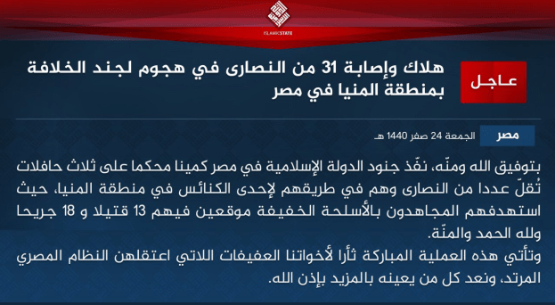 Στην ανακοίνωση της η ΙSIS με την οποία διεκδίκησε την τρομοκρατική κατά προσκυνητών Κοπτών χθες στην Αίγυπτο αναφέρει : ”Mε την χάρη του Αλλάχ και την επιτυχία του οι στρατιώτες του Ισλάμ έκαναν μια προσεκτική ενέδρα σε 3 λεωφορεία που μετέφεραν πολλούς χριστιανούς. Αυτοί ήταν καθ΄οδόν προς μια εκκλησία της περιοχής της Minya όταν οι μουτζαχεντίν τους στόχευσαν με όλα τα είδη ελαφρών όπλων κάνοντας 13 νεκρούς και 18 τραυματίες. Αυτή η επιχείρηση είναι μια ευλογημένη απάντηση στη σύλληψη των τιμημένων αδερφών μας που φυλακίστηκαν από την αποστατική κυβέρνηση Αιγύπτου και υποσχόμαστε ακόμη χειρότερα γι αυτούς με την άδεια του Αλλάχ, που τη βοηθούν.”