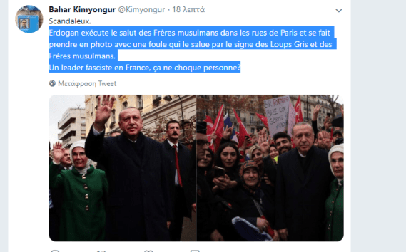 Την ανάρτηση έκανε πριν λίγο ο Bahar Kimyongur βελγο-τούρκος ακτιβιστής και ιστορικός στο twitter του καταγγέλοντας ως σκανδαλώδη τη συμπεριφορά του Τούρκου Προέδρου ενώ καταλήγει λέγοντας ”ένας φασίστας αρχηγός στο Παρίσι. Αυτό δεν σοκάρει κανέναν;”