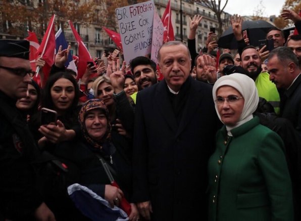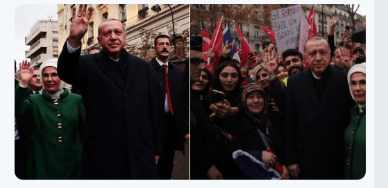 O Erdogan προκάλεσε και πάλι αυτή τη φορά στο Παρίσι όπου πήγε για να μετάσχει στις εκδηλώσεις για τα 100 χρόνια από το τέλος του Α΄Παγκοσμίου Πολέμου. Ο Εrdogan είναι 1 από τους 72 αρχηγούς κρατών που παραβρέθηκαν. Χαιρέτισε με το σήμα των Αδερφών Μουσουλμάνων μέσα στους δρόμους του Παρισιού υποστηρικτές του που του ανταπέδωσαν κάνοντας επίσης το σήμα των Αδερφών Μουσουλμάνων και αυτό των Γκρίζων Λύκων….