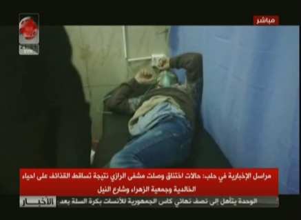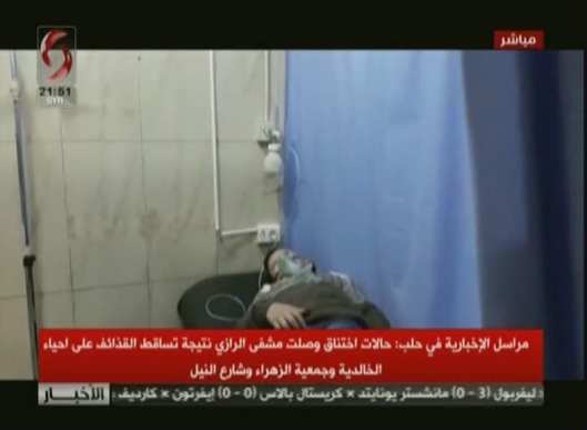 Οι τρομοκράτες χτύπησαν την πόλη του Χαλεπίου με χημικά αέρια με αέριο χλωρίου και συγκεκριμένα τη συνοικία al-Khalidiyah. Οι τρομοκράτες χτύπησαν με ρουκέτες τις συνοικίες Zahra , Νέα chahba κ.α.Πολλά θύματα τις επίθεσης διακομίστηκαν για νοσηλεία στο πανεπιστημιακό νοσοκομείο Χαλεπίου με συμπτώματα ασφυξίας, σπασμούς, τάση προς εμετό κλπ…Φορούν μάσκες γιατροί και τραυματίες.Oι δημοσιογράφοι του Χαλεπίου κάνουν ρεπορτάζ μέσα από το νοσοκομείο. Οι τρομοκράτες επιτέθηκαν στις συνοικίες Khalidiyah και οδός Νείλου με ρουκέτες που περιείχαν αέριο χλωρίου.Αρχικές εκτιμήσεις μιλούν για 15 πολίτες που μεταφέρθηκαν με συμπτώματα ασφυξίας στο νοσοκομείο μεταξύ των οποίων και παιδιά σύμφωνα με sana….