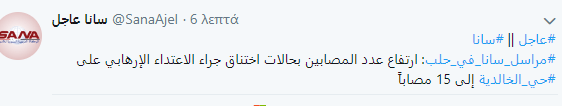 To sputnik επικαλούμενο το sana μιλά για 38 τραυματίες από ρουκέτες με χλώριο στη συνοικία al-Khalidiah. Η συριακή τηλεόραση είπε πως χτυπήθηκαν ομοίως οι συνοικίες al-Zahra και οδός του Nil.Βουλευτής Χαλεπίου μιλά για 41.