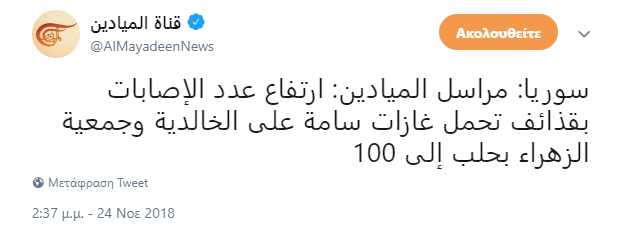 Σύμφωνα με τον ανταποκριτή του το Al-Mayadeen αναφέρει πως μεγάλος αριθμός ρουκετών που μετέφεραν τοξικά αέρια έπεσαν στις συνοικίες Khalidiya και Al-Ζahra στο Χαλέπι και υπάρχουν 100 τραυματίες.
