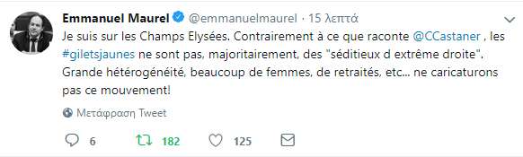 ”Eίμαι στα Ηλύσια Πεδία. Αντίθετα με αυτό που διηγείται ο Υπ. Εσωτερικών ο @CCastaner ,τα #giletsjaunes δεν είναι , πλειοψηφικά, “εξεγερμένοι της ακροδεξιάς”. Μεγάλη ετερογένεια, πολλές γυναίκες, συνταξιούχοι κλπ.c… δεν γελοιοποιούμε αυτό το κίνημα !” Ανέβασε πριν λίγο στο twitter του ο αρχηγός της αριστερής πτέρυγας του Σοσιαλιστικού Γαλλικού Κόμματος (PS) και ευρωβουλευτής ο Emmanuel Maurel.