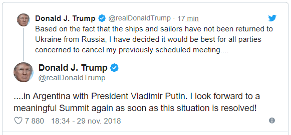 ”Με βάση το γεγονός ότι τα πλοία και οι ναύτες δεν επιστράφηκαν στην Ουκρανία από τη Ρωσία αποφάσισα ότι θα ήταν καλύτερο για όλες τις αφορούμενες πλευρές ν΄ακυρώσω την προβλεπόμενη συνάντηση μου στην Αργεντινή” με Πούτιν…..Ανυπομονώ να συμμετάσχω και πάλι σε μια εποικοδομητική συνάντηση Κορυφής με κ. Πούτιν όταν η κατάσταση θα έχει επιλυθεί ».