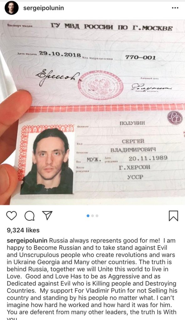 O διάσημος Ουκρανός χορευτής Sergei Polunin στις 29.10.18 πήρε ρώσικο διαβατήριο και ρωσική υπηκοότητα. Είναι θαυμαστής του Πούτιν και αντικαθεστωτικός στη χώρα του. Όταν έλαβε το ρωσικό διαβατήριο δήλωσε : «Είμαι ευτυχής που παίρνω θέση εναντίον των κακών ανθρώπων που δημιουργούν πολέμους στην Ουκρανία, την Γεωργία και σε άλλες χώρες ».