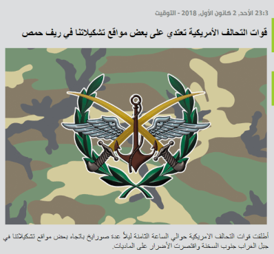 O SAA με επίσημο ανακοινωθέν του επιβεβαιώνει πως οι δυνάμεις του συνασπισμού των ΗΠΑ άνοιξαν πυρ κατά θέσεων σχηματισμών μας στην επαρχία Homs. Περί τις 8:00 μ.μ, οι δυνάμεις της συμμαχίας των USΑ εκτόξευσαν αρκετούς πυραύλους σε κάποιες θέσεις σχηματισμών μας σε Jabal al-Gharab, Νότια της Sukhna, αλλά υπάρχουν μόνο υλικές ζημιές. Το Υπ. Άμυνας επιβεβαιώνει.