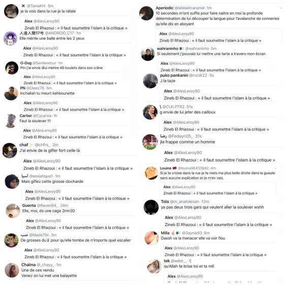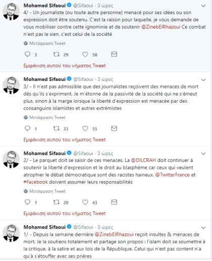Σήμερα 17/12/18 ο Mohamed Sifaoui εκδότης του περιοδικού ”Contre Terrorisme” καταγγέλει ότι μια δημοσιογράφος δημόσια δέχεται απειλές θανάτου από εξτρεμιστές ισλαμιστές και ανεβάζει στο twitter αγωνιώδεις κλήσεις στις αρχές.Ανάρτησε στο twitter του σήμερα τα εξής: