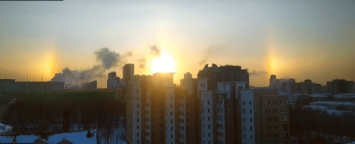 Bίντεο από τη ρωσική πόλη Yekaterinburg παρουσιάζει ένα σπάνιο φυσικό φαινόμενο που ονομάζεται φωτοστέφανο φωτός. Το μοναδικό φαινόμενο είναι η εμφάνιση «τριών ήλιων» που ακτινοβολούν ταυτόχρονα λόγω της αντανάκλασης του φωτός στους κρυστάλλους του πάγου στον αέρα, σύμφωνα με το site «rt 29.12.18». Όπως και να έχει Αγία Ρωσία της ”Τρισηλίου Θεότητας ”, ”τρισήλιον υμνούμεν κράτος”..