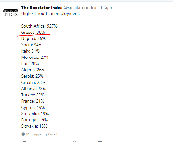 Σύμφωνα με το Παρατηρητήριο The Spectator Index η Ελλάδα με ποσοστό 38% είναι δεύτερη πάνω από τη Νιγηρία και κάτω από την Ν Αφρική στην ανεργία νέων. Η ΕΕ αφρικανοποίησε την Ελλάδα…(το ποσοστό 38.5% παρουσιάζεται τον Οκτώβρη και πιστοποιείται από τον OCDE).