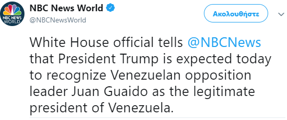 Η διοίκηση Trump εγκαινιάζοντας νέα πολιτικά ήθη που θ΄ανοίξουν τους ασκούς του Αιόλου στη διεθνή πολιτική σκηνή θα μπορούσε ν΄αναγνωρίσει τον επικεφαλή της αντιπολίτευσης της Βενεζουέλα Juan Guaido ως νόμιμο Πρόεδρο της χώρας αυτής ήδη από την Τετάρτη αναφέρει το Reuters . Πρόκειται για το τέλος του εναπομείναντος προσχηματικού διεθνούς δικαίου και της διεθνής νομιμότητας…Αν εφαρμοστεί ως πρακτική και αλλού θα συμπαρασύρει ολόκληρες χώρες σε εμφυλίους και αιματοκυλίσματα. Πολύ επικίνδυνη όσο και πρωτοφανής τακτική ως απαράδεκτη κι ωμή παρέμβαση στις εσωτερικές υποθέσεις τρίτης χώρας..Το λιβυκό μοντέλο πολλαπλών κυβερνήσεων πιλοτικά χρησιμοποιήθηκε για να δοκιμαστεί κι αλλού.