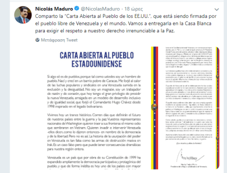 O Maduro παρουσίασε την Πέμπτη μια ανοιχτή επιστολή προς το λαό των ΗΠΑ κατά της ανάμειξης της κυβέρνησής του. Θ΄αποσταλεί στο Λευκό Οίκο.