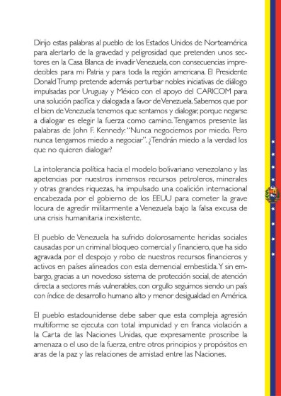 “Ζούμε σε μια ιστορική έκσταση, μέρες που θα καθορίσουν το μέλλον των χωρών μας μεταξύ πολέμου κι ειρήνης.Οι εκπρόσωποί σας στην Washington θέλουν ν΄αντιμετωπίσουν τα σύνορά μας με το ίδιο μίσος που αυτοί πήγαν στο Vietnam, θέλουν να έρθουν να κατακτήσουν τη Venezuela όπως αυτοί το είπαν στο όνομα της ελευθερίας “, αναφέρει η επιστολή.