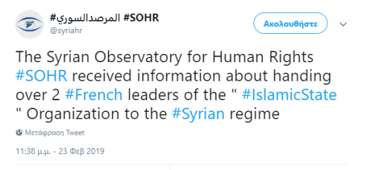 Tο αντιπολιτευόμενο Συριακό Παρατηρητήριο με έδρα το Λονδίνο (SOHR) ανακοίνωσε στις 24/2/19 ότι δέχθηκε την πληροφορία πως δυο Γάλλοι ηγέτες της τρομοκρατικής οργάνωσης Ισλαμικό Κράτος (Daesh) παραδόθηκαν στο συριακό κράτος.