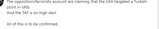 Λογαριασμοί της αντιπολίτευσης και τρομοκρατών αλλά και τούρκικοι λογαριασμοί επιμένουν πως ο SAA στόχευσε μια τουρκική θέση στο Idlib και η TAF είναι σε υψηλή επιφυλακή. Όλα αυτά χρήζουν επιβεβαίωσης αναφέρει φιλοκυβερνητική πηγή.
