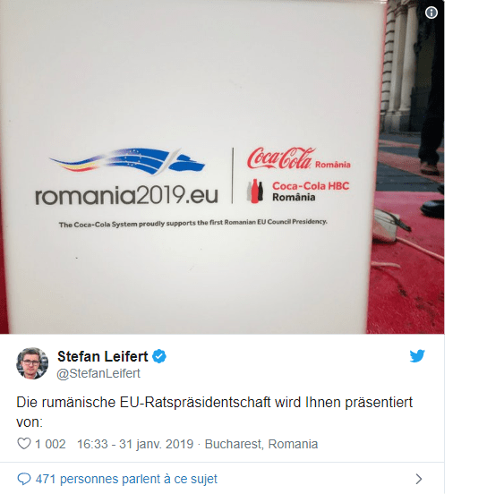 H Coca-Cola σπονσοράρει την προεδρία του Συμβουλίου της Ευρωπαϊκής Ένωσης κατήγγειλε η ΜΚΟ η Foodwatch.Δεν είναι η πρώτη φορά που μια εταιρία σπονσοράρει γεγονότα που συνδέονται με τον πολιτικό κόσμο. Ήδη από το 2011, η πολυεθνική είχε κλείσει μια συμφωνία με την Πολωνία που προήδρευε τότο στο Συμβούλιο της ΕΕ. Σήμερα είναι η Ρουμανία που ασκεί αυτή την προεδρία για 6 μήνες και η χώρα δεν στερείται από το να επιδεικνύει αυτή την εταιρική σχέση. Σε μια σημαντική συνάντηση βρίσκουμε λογότυπα της Coca-Cola αναρτημένα λίγο πολύ παντού όσο και “poufs” και διανομείς ποτών. Γι αυτό το λόγο η μάρκα έγινε ένας “πλατινένιος εταίρος”, ένας status που χορηγείται σε εταιρίες που χορηγούν την προεδρία με ποσό ύψους 40.000 euros και τους δίνει το δικαίωμα να εκθέσουν το υλικό τους προώθησης σύμφωνα με πληροφορίες της Euractiv.