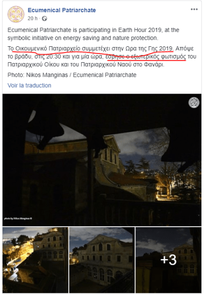 Το Φανάρι έσβησε ..τα φώτα του για να γιορτάσει την Ώρα της Γης. Και παγανιστής ο Βαρθολομαίος. Στην επίσημη σελίδα του στο fb το ”Ecumenical Patriarchate” -το Οικουμενικό Πατριαρχείο αναφέρει πως ”συμμετέχει στην Ωρα της Γης 2019 ως συμβολική πρωτοβουλία για την εξοικονόμηση ενέργειας και την προστασία της φύσης.”Το ανακοινωθέν προσθέτει πως ”απόψε το βράδυ, στις 20:30 και για μία ώρα, έσβησε ο εξωτερικός φωτισμός του Πατριαρχικού Οίκου και του Πατριαρχικού Ναού στο Φανάρι.” Το Φανάρι ούτως ή άλλως έσβησε…κι αν υπάρχει ένας συμβολισμός σε αυτή την κίνηση είναι ότι έσβησε το πνευματικό του φως ”το φως ιλαρόν”. Η εκκοσμίκευση του ”Φάρου” της Ορθοδοξίας δεν έχει πάτο..Γι αυτό τόσο δήθεν οικολογική ευαισθησία τελικά είναι παγανιστής ….