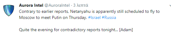 Άλλη αναφορά από άλλο μέσο διαψεύδει την προηγούμενη και λέει ”σε αντίθεση με προηγούμενες αναφορές, ο Νετανιάχου είναι προφανώς ακόμα προγραμματισμένος να πετάξει στη Μόσχα για να συναντήσει τον Πούτιν την Πέμπτη… ”